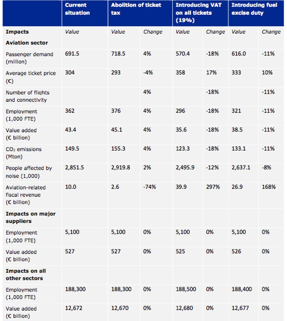 CE Delft得出结论,“新的或增加的航空税通常会对航空业产生负面影响,但对成员国内部的总体就业,财政收入和GDP的影响将接近于零”,并且“ 或增加税收将减少乘客和航班的数量以及对环境的影响。”